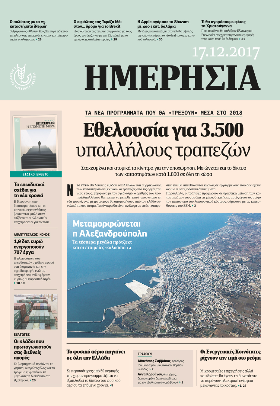 Η εφημερίδα με όλες τις εξελίξεις στην οικονομική και επιχειρηματική αγορά κυκλοφορεί αυτή την Κυριακή με όλα τα νέα για το νέο γύρο εθελούσιας εξόδου στις τράπεζες και τις συρρίκνωσης των καταστημάτων αλλά και τα τέσσερα μεγάλα πρότζεκτ που μεταμορφώνουν την Αλεξανδρούπολη.