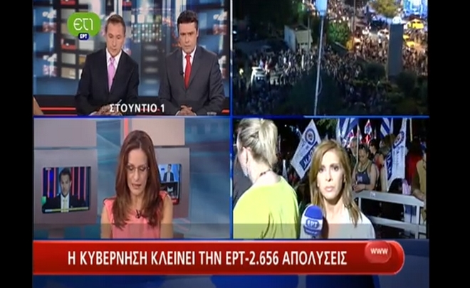 Για πρώτη φορά στην Ελλάδα αλλά και σε ολόκληρη την Ευρώπη, δημοκρατικά εκλεγμένη κυβέρνηση κατέβασε τους διακόπτες και έκοψε το σήμα εκπομπής της δημόσιας τηλεόρασης και ραδιοφωνίας, με απόφαση που δεν πέρασε από την Ολομέλεια της Βουλής. Ακόμα και επί δικτατορίας η κρατική τηλεόραση δε σίγησε ούτε λεπτό.