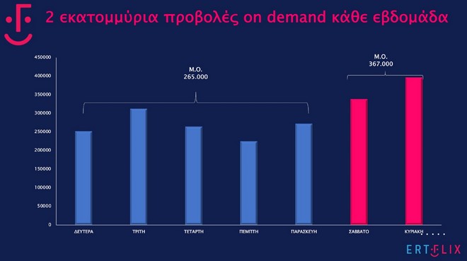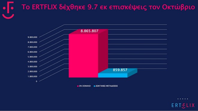 Το ERTFLIX μετρά 2 εκατομμύρια προβολές την εβδομάδα, 295.000 κάθε μέρα, ενώ μόνο τον Οκτώβριο η πλατφόρμα δέχθηκε 9,7 εκατομμύρια επισκέψεις. Συγκεκριμένα, τον Οκτώβριο ένας τεράστιος αριθμός τηλεθεατών 8.865.000 on demand, επέλεξαν να παρακολουθήσουν τα αγαπημένα τους προγράμματα στον χρόνο που εκείνοι επιθυμούν και όχι όταν μεταδίδονταν από την τηλεόραση.