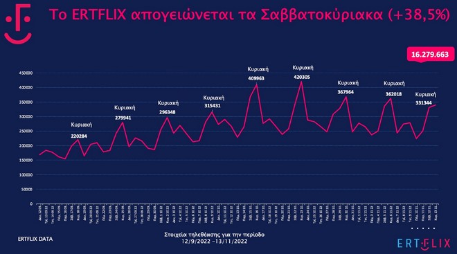 Όπως σημείωσε ο κ. Ζούλας, τα Σαββατοκύριακα καταγράφεται αύξηση κατά 38,5% των επισκέψεων στο ERTFLIX, ενώ μια απροσδόκητη αύξηση σημειώνεται και τις Τρίτες, με την εξήγηση να είναι απλή: Η πιο δημοφιλής φέτος σειρά της ΕΡΤ, το “Κάνε ότι κοιμάσαι” προβάλλεται κάθε Δευτέρα βράδυ και η επόμενη μέρα είναι αυτή που πολλοί επιλέγουν να παρακολουθήσουν τα νέα της επεισόδια.
