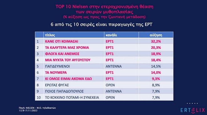 Σε πίνακα που παρουσιάστηκε με το Top 10 της Nielsen για 9 εβδομάδες από τις 13/9-7/11, οι 6 σειρές στις 10 είναι παραγωγές της ΕΡΤ. Παρόλα αυτά, ακόμη και αυτή η μεγάλη αύξηση που καταγράφεται (20% – 30%) αφορά μόνο στις τηλεοράσεις και όχι στους υπολογιστές, στα κινητά τηλέφωνα και στα tablet. Με απλά λόγια, αν κάποιος δεν παρακολουθεί ετεροχρονισμένα από την τηλεόραση, δεν προσμετράται σ’ αυτό στο ποσοστό του 32%.
