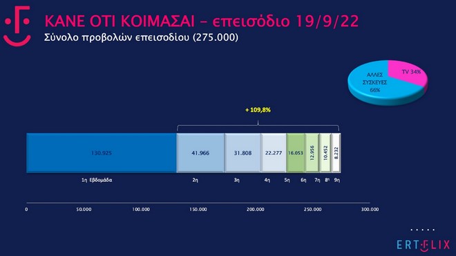 Συγκεκριμένα, το επεισόδιο που προβλήθηκε στις 19 Σεπτεμβρίου δέχθηκε περισσότερες από 226.000 επισκέψεις μέσα σε έναν μήνα. Και από αυτές τις επισκέψεις το 73,4% έγιναν μετά τις 7 πρώτες μέρες, στοιχείο που δείχνει και τη δυναμική αυτής της σειράς. Αν μάλιστα επεκτείνουμε την περίοδο μέτρησης για τις 9 εβδομάδες που αντλήθηκαν τα στοιχεία είναι ακόμη πιο εντυπωσιακά τα αποτελέσματα, καθώς δείχνουν ότι η τηλεθέασή του υπερβαίνει το 100% μετά την πρώτη εβδομάδα, φτάνοντας συνολικά τις 275.000 προβολές.