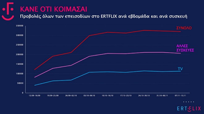 Εντυπωσιακή είναι η άνοδος του ERTFLIX, της online streaming πλατφόρμας της ΕΡΤ, που έκανε την εμφάνισή του πριν από 2,5 χρόνια, ξεπερνώντας σε μεγάλο βαθμό τις προσδοκίες των ιθύνοντων. Μέχρι στιγμής, δεν υπήρχαν ακριβείς μετρήσεις για την τηλεθέαση του ERTFLIX, καθώς τα ποσοστά που ανακοινώνει η Nielsen περιλαμβάνουν μόνο τα προγράμματα των καναλιών.
