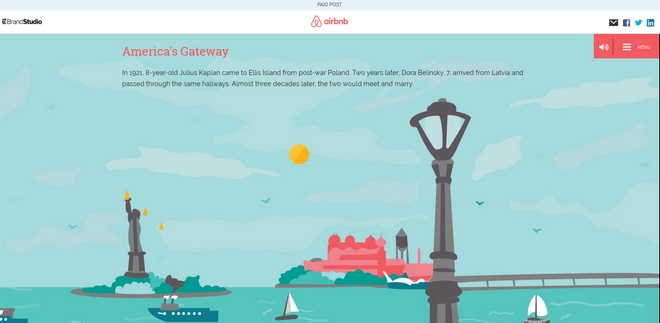 Σε συνεργασία με την New York Times και το T Brand Studio (το πολυβραβευμένο brand marketing studio των NYTimes), η Airbnb κατάφερε να ταιριάξει “αριστοτεχνικά” την ιστορία του ταξιδιού και της φιλοξενίας. Μέσα από μία διαδραστική σελίδα γεμάτη παλιές φωτογραφίες, έγγραφα και ιστορικά γεγονότα, ταξιδεύουμε πίσω στο χρόνο, στο Ellis Island, ένα μέρος με μεγάλη ιστορία: εκεί όπου, πριν 2 αιώνες, κατέφταναν τα υπερωκεάνια από την Ευρώπη, προκειμένου να «δηλωθούν» οι επιβαίνοντες, πριν κάνουν μια νέα αρχή. Τι πιο ευφυές από το Airbnb προκειμένου να συνδέσει την τότε φιλοξενία με αυτήν που παρέχεται τώρα μέσω της πλατφόρμας της;