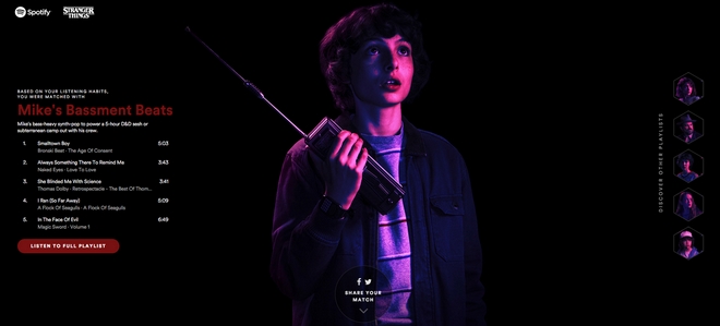 18,5 εκατομμύρια Αμερικανών παρακολούθησαν το πρώτο επεισόδιο Stranger Things μέσα στις 3 μέρες της κυκλοφορίας του. Νούμερα που σίγουρα δεν άφησαν αμέτοχο και αδιάφορο το Spotify, το οποίο, φρόντισε να ταιριάξει τη μουσική των χρηστών της πλατφόρμας με κάποιον χαρακτήρα της αγαπημένης σειράς, ανάλογα με τις μουσικές τους συνήθειες.