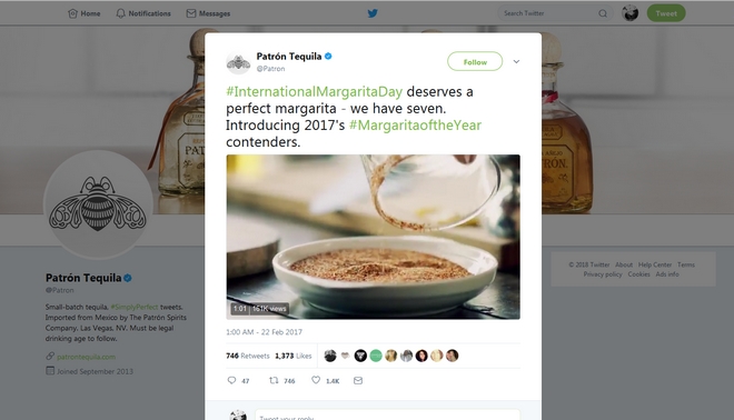 Για την Παγκόσμια Ημέρα Μαργαρίτας (22 Φεβρουαρίου), η Patrón Tequila σε συνεργασία το Twitter, δημιούργησε μία ολόκληρη καμπάνια που χτίστηκε πάνω στο hashtag #MargaritaoftheYear, ωθώντας τους χρήστες να ψηφίσουν μία από τις 7 καινοτόμες συνταγές κοκτέιλ.