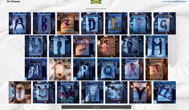 H βρετανική Telegraph σε συνεργασία με την IKEA έφτιαξαν ένα πρωτότυπο quiz προκειμένου να δώσουν στο αναγνωστικό κοινό χρήσιμες συμβουλές για το πώς θα κοιμάσαι καλύτερα και ευκολότερα. Οι αναγνώστες απαντούσαν σε μερικές ερωτήσεις σχετικές με τον ύπνο, καταλήγοντας στην αντιστοίχη συμβουλή- γράμμα της αγγλικής αλφάβητου. Το πιο ενδιαφέρον όμως της υπόθεσης είναι ότι κάθε γράμμα, συνοδευόταν από μία φωτογραφία ενός ή περισσότερων (ανάλογα με το γράμμα) ανθρώπινων σωμάτων που το σχημάτιζαν. Μπορείς να σκεφτείς πιο έξυπνο τρόπο για να ανακαλύψεις τα προϊόντα IKEA που σχετίζονται με τον ύπνο;