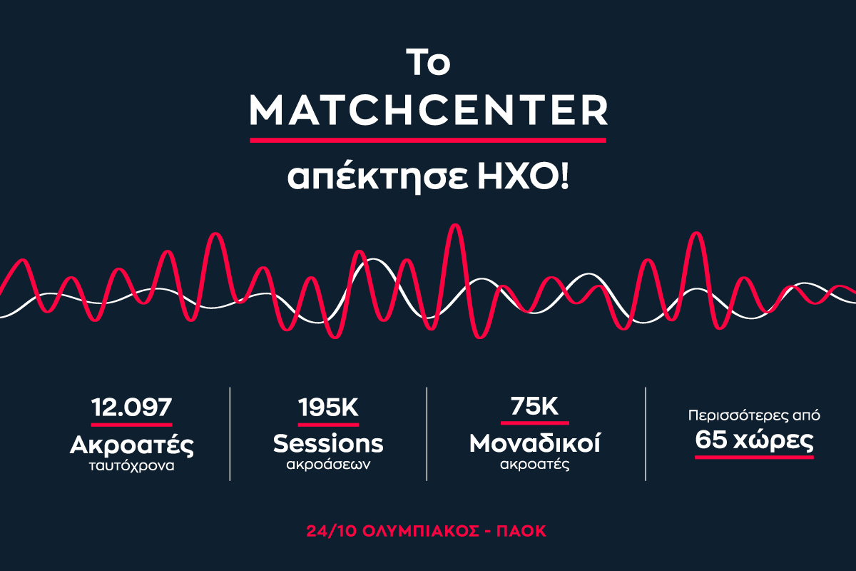 Πάνω από 12 χιλιάδες ακροατές σε περισσότερες από 65 χώρες*, επέλεξαν ταυτόχρονα να ακούσουν την ηχητική περιγραφή του αγώνα από το Matchcenter του SPORT24 και να ζήσουν λεπτό προς λεπτό τις μεγάλες φάσεις και τα γκολ του αγώνα. Η ηχητική περιγραφή του αγώνα άγγιξε τις 195 χιλιάδες ακροάσεις ενώ κατέγραψε 75 χιλιάδες μοναδικούς ακροατές.