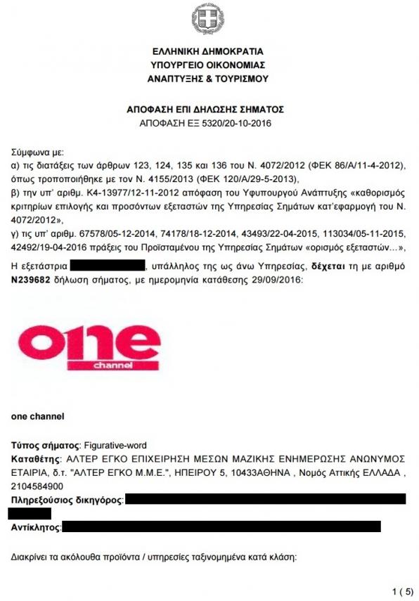 Η εταιρία Alter Ego ΜΜΕ Α.Ε., συμφερόντων Βαγγέλη Μαρινάκη και μία από τις εταιρίες που έχουν λάβει μία από τις τέσσερις τηλεοπτικές άδειες εθνικής εμβέλειας κατοχύρωσε το σήμα, αλλά και το όνομα του νέου τηλεοπτικού σταθμού. Και το όνομα αυτού, One Channel, το οποίο θα διαθέτει το παρακάτω λογότυπο.