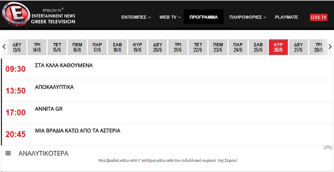 Ενδιαφέρον παρουσιάζει πως από την επίσημη ιστοσελίδα του σταθμού εξαφανίστηκε η εκπομπή Bravo Ρούλα, την οποία δεν μπορεί να βρει ο χρήστης στη λίστα με τις ψυχαγωγικές εκπομπές. Ακόμη πιο ιντριγκαδόρικο είναι το γεγονός πως η βραδινή εκπομπή από τη Σύρο θα βγει κανονικά, με άλλο όνομα και προφανώς, άλλο παρουσιαστή. Έτσι το “Bravo Ρούλα” έγινε “Μια νύχτα κάτω από τα αστέρια” στο πρόγραμμα του σταθμού χωρίς να επεξηγεί αναλυτικά ποιος θα είναι ο παρουσιαστής και αν οι προγραμματισμένοι καλεσμένοι που θυμίζουμε ήταν οι Αντώνης Ρέμος, Έλενα Παπαρίζου και Γιώργος Πρίντεζης θα είναι παρόντες στην εκπομπή.