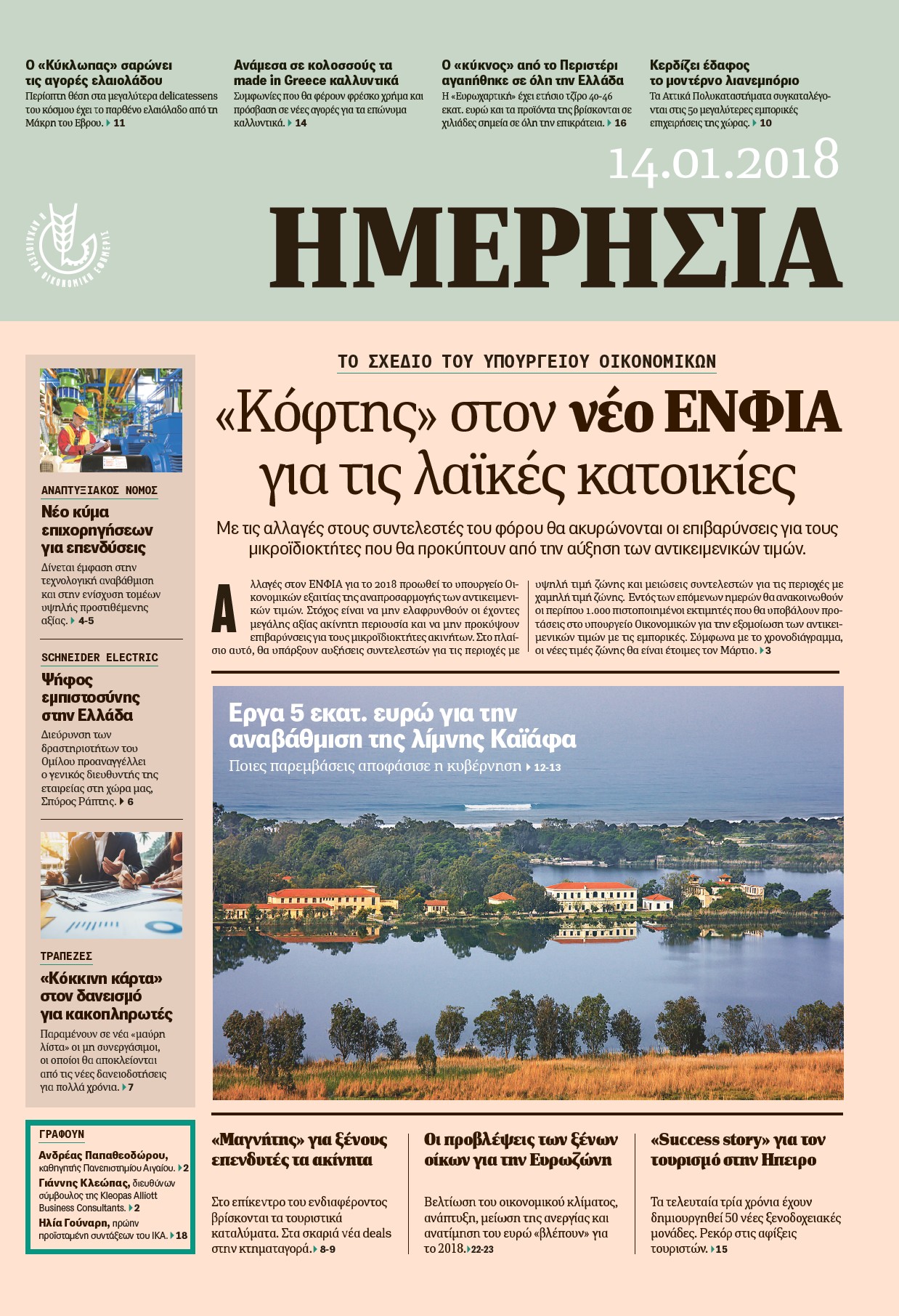 Η εφημερίδα με όλες τις εξελίξεις στην οικονομική και επιχειρηματική αγορά κυκλοφορεί και αυτή την Κυριακή: Νέο ΕΝΦΙΑ- κόφτη στις επιβαρύνσεις στις μικρές ιδιοκτησίες από την αύξηση των αντικειμενικών τιμών που θα φέρει η ευθυγράμμιση τους με τις εμπορικές σχεδιάζει το υπουργείο Οικονομικών.