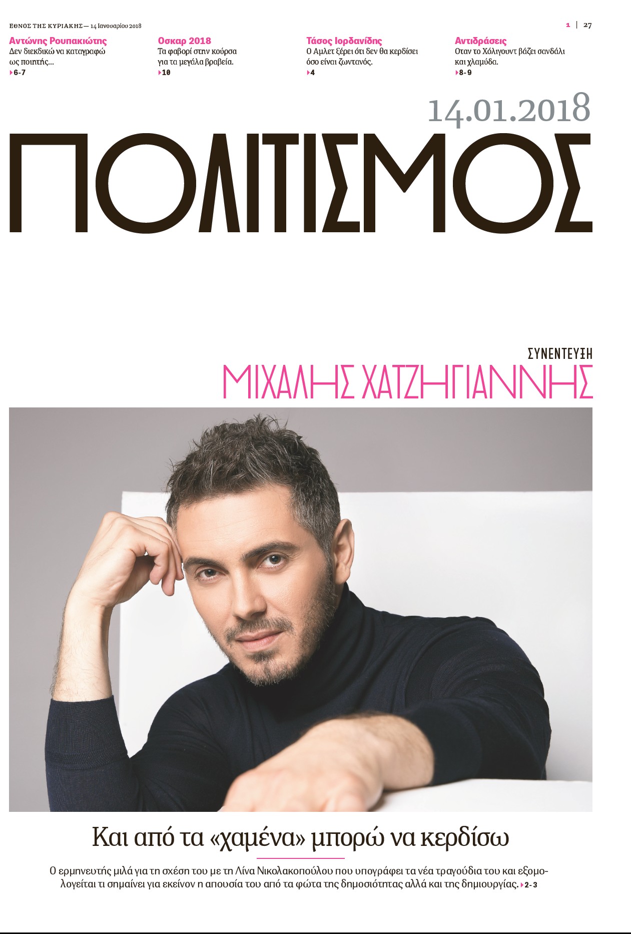Θέατρο, βιβλίο, μουσική, κινηματογράφος και ό,τι αφορά τις τέχνες σε ένα πλούσιο ένθετο 16 σελίδων. Αυτή την Κυριακή έρχεται με συνέντευξη του Μιχάλη Χατζηγιάννη, με αφορμή τις εμφανίσεις του στο “ΦΩΣ” με τον Θανάση Αλευρά, αλλά και τα καινούρια του τραγούδια, όλα σε δική του μουσική και σε στίχους της Λίνας Νικολακοπούλου, πλην ενός του Σταμάτη Κραουνάκη και με τη συμμετοχή της Δήμητρας Γαλάνη. Ακόμη, συνέντευξη του Τάσου Ιορδανίδη, ιδρυτή του θεάτρου Άνεσις και “Αμλετ” στην ομώνυμη σεξπηρική παράσταση που πρωταγωνιστούν ακόμα οι Πέμη Ζούνη, Ιωάννα Παππά κλπ., και συνέντευξη του δικηγόρου και πρώην υπουργού Αντώνη Ρουπακιώτη που μόλις κυκλοφόρησε την πρώτη του ποιητική συλλογή με τίτλο “¨Εγώ δεν είμαι ποιητής”.