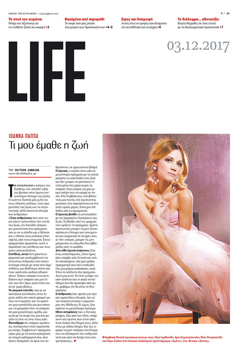 Το ειδικό ένθετο για τον σύγχρονο τρόπο ζωής φιλοξενεί την ηθοποιό Ιωάννα Παππά η οποία αποκαλύπτει που βρίσκει την κινητήριο δύναμηα της ζωής. Μαζί κυκλοφορούν ειδικά θέματα για το στυλ του χειμώνα, τη διατροφή, τη γυμναστική, τον καφέ και τη γαστρονομία.