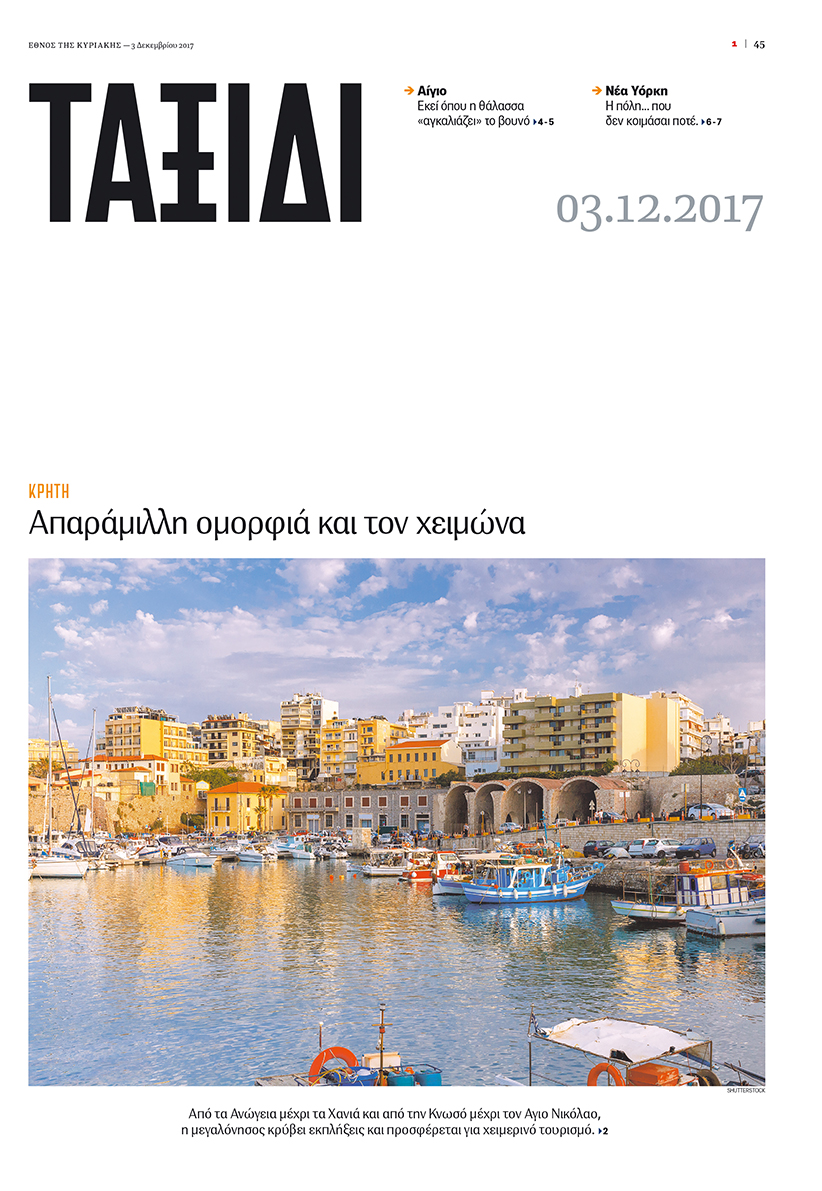 Το ειδικό ένθετο με προτάσεις για τις πιο ωραίες αποδράσεις από την καθημερινότητα, μας ταξιδεύει στην απαράμιλλη ομορφιά της χειμωνιάτικης Κρήτης, την πλανεύτερα μητρόπολη που ακουέι στο όνομα Νέα Υόρκη αλλά και το Αίγιο, εκεί όπου η θάλασσα συναντά το βουνό.
