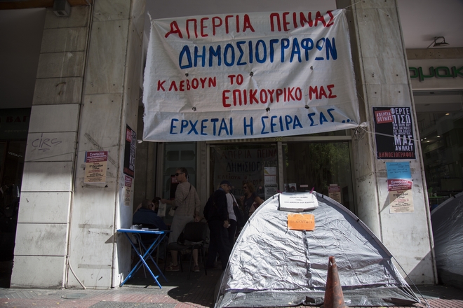 Πέντε γυναίκες δημοσιογράφοι πραγματοποιούν απεργία πείνας και βρίσκονται εδώ και μια εβδομάδα έξω απ' το κτήριο της ΕΣΗΕΑ ζητώντας άμεση λύση στο αδιέξοδο που έχει προκύψει με τον οργανισμό επικουρικής ασφάλισης και περίθαλψης των δημοσιογράφων.