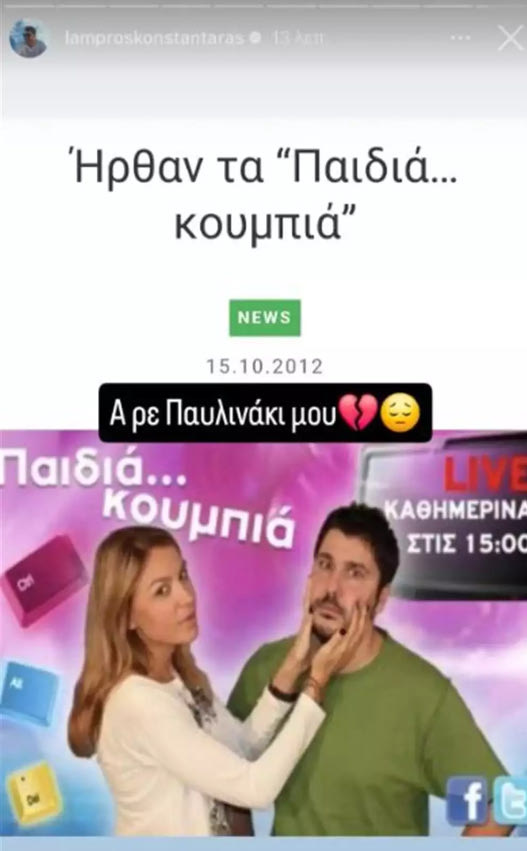 Ο Λάμπρος Κωνσταντάρας δημοσίευσε στον προσωπικό του λογαριασμό στο Instagram μία κοινή τους φωτογραφία ενώ έγραψε με θλίψη: «Α ρε Παυλινάκι μου».