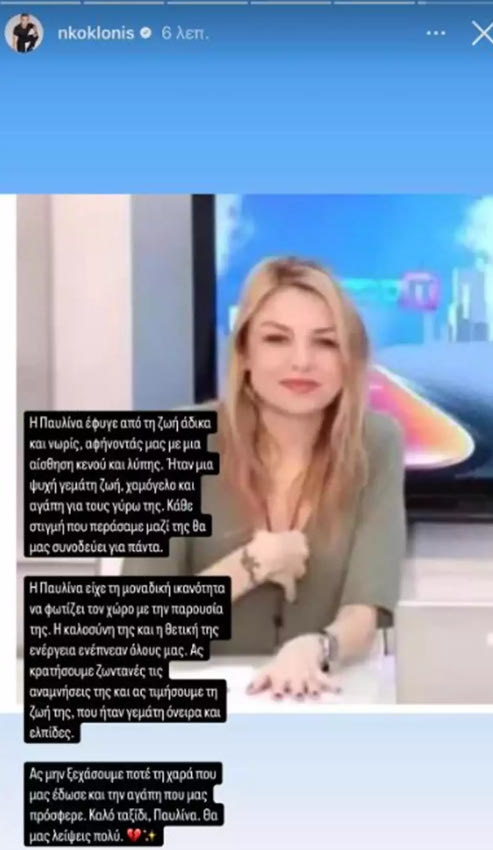 «Η Παυλίνα έφυγε από τη ζωή άδικα και νωρίς αφήνοντάς μας με μια αίσθηση κενού και λύπης. Ήταν μια ψυχή γεμάτη ζωή, χαμόγελο και αγάπη για τους γύρω της. Κάθε στιγμή που περάσαμε μαζί της θα μας συνοδεύει για πάντα. Η Παυλίνα είχε τη μοναδική ικανότητα να φωτίζει τον χώρο με την παρουσία της. Η καλοσύνη της και η θετική της ενέργεια ενέπνεαν όλους μας. Ας κρατήσουμε ζωντανές τις αναμνήσεις της και ας τιμήσουμε τη ζωή της που ήταν γεμάτη όνειρα και ελπίδες. Ας μην ξεχάσουμε ποτέ τη χαρά που μας έδωσε και την αγάπη που μας πρόσφερε. Καλό ταξίδι Παυλίνα. Θα μας λείψεις πολύ», έγραψε χαρακτηριστικά ο Νίκος Κοκλώνης.