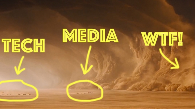 Μία εικόνα ισούται με χίλιες λέξεις. Το καραβάνι των μίντια καταδιώκεται από το καραβάνι της τεχνολογίας και το μεταξύ τους κυνηγητό φαίνεται να οδηγείται αντιμέτωπο με αμμοκαταιγίδα. «Έλεγα να χρησιμοποιήσω μία ασπρόμαυρη φωτογραφία ενός φράγματος, με ένα ζευγάρι που κινείται κατά μήκος, σχεδόν σε ρομαντικό περίπατο για να περιγράψω τι συμβαίνει στο χώρο των μίντια σήμερα. Αλλά τελικά, η πραγματικότητα είναι διαφορετική και επέλεξα τη δεύτερη φωτογραφία», ανέφερε ο κ. Δρακουλαράκος κατά την έναρξη της ομιλίας του, θέλοντας με αυτόν τον τρόπο να υπογραμμίσει την αβεβαιότητα, αλλά και την ιλιγγιώδη ταχύτητα με την οποία εξελίσσονται οι νέες τεχνολογίες.