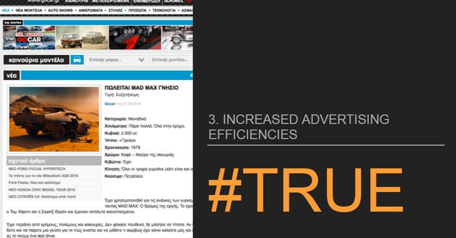 Την ίδια στιγμή, ιδιαίτερη αναφορά δόθηκε στις εναλλακτικές που μπορεί κανείς να διαφημιστεί Online, με κορυφαίο παράδειγμα την «ύπουλη native διαφήμιση» του gocar.gr σε review της ταινίας Mad Max. «Ακριβώς επειδή το gocar σκέφτηκε να διαφημίσει το ίδιο το όχημα της ταινίας, πατώντας στο Google, μπορεί κανείς να δει στα περισσότερα άρθρα, τη σχετική διαφήμιση».