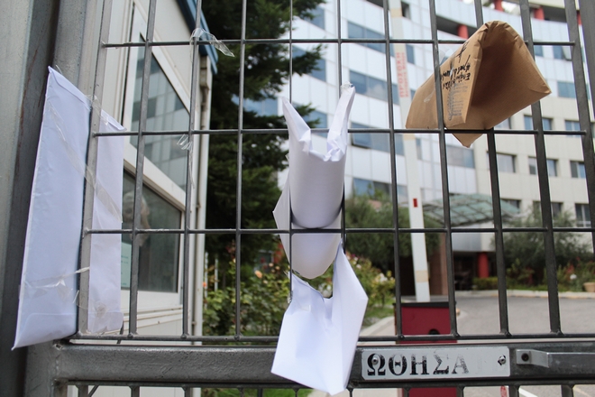 Δεύτερη μέρα της διαδικασίας και η είσοδος της Γενικής Γραμματείας Ενημέρωσης και Επικοινωνίας γέμισε με αντίγραφα ασφαλιστικών μέτρων τα οποία θυροκόλλησαν δικαστικοί επιμελητές.