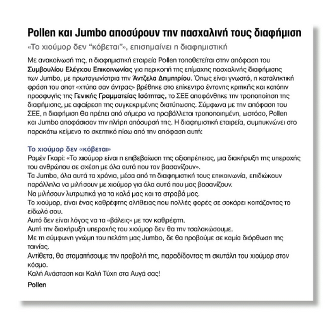 Με ανακοίνωσή της η διαφημιστική εταιρεία Pollen τοποθετήθηκε στην απόφαση του Συμβουλίου Ελέγχου Επικοινωνίας για περικοπή της διαφήμισης, με πρωταγωνίστρια την Άντζελα Δημητρίου.