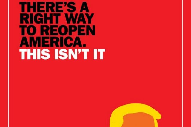 Το έντυπο, όπως και όλες τις προηγούμενες φορές που είχε τον Τραμπ στο εξώφυλλό του, καυτηριάζει τις κινήσεις του, όπως την απόφασή του να ανοίξει εκ νέου την οικονομία κόντρα στις συμβουλές των ειδικών δημόσιας υγείας.