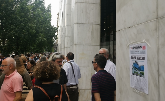 Έξω από το κτίριο της Alpha Bank βρίσκονται το πρωί της Τρίτης οι πρώην εργαζόμενοι της Ελευθεροτυπίας, οι οποίοι επί 9 χρόνια περιμένουν να λάβουν αποζημιώσεις και δεδουλευμένα. Οι τράπεζες άσκησαν ανακοπή στην προγραμματισμένη καταβολή μέρους των χρημάτων, με αποτέλεσμα να κινδυνεύουν με νέα αναμονή ετών.