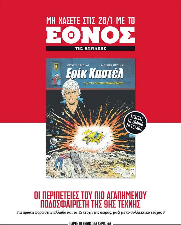 Oι περιπέτειες του Ερίκ Καστέλ συνεχίζονται με το “Έθνος της Κυριακής” το οποίο δίνει την ευκαιρία στο ελληνικό κοινό να συγκεντρώσει για πρώτη φορά και τα 16 τεύχη της συλλογής του θρυλικού κόμικ, καθώς κάποια εξ’ αυτών δεν κυκλοφόρησαν ποτέ στην Ελλάδα! Στις 28 Ιανουαρίου έρχεται μάλιστα το 7ο τεύχος “Η νύχτα του Τιμπιντάμπο” το οποίο θεωρείται σπάνιο στα μέρη μας καθώς λίγοι έχουν την τύχη να το βλέπουν να κοσμεί τη συλλογή τους με τον θρυλικό ποδοσφαιριστή.
