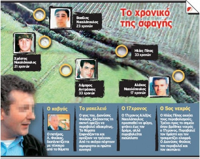 Από τη mixanitouxronou.gr : Τον Νοέμβριο του 2006 ένα πολλαπλό έγκλημα συγκλόνισε ολόκληρη την Ελλάδα. Πέντε νέοι άντρες που είχαν βγει για κυνήγι σε μια περιοχή του Αγρινίου δολοφονήθηκαν εν ψυχρώ. Ήταν οι Λάμπρος Αντρέσσας (33 ετών), Βασίλης Νικολόπουλος (23 ετών), Χρήστος Νικολόπουλος (21 ετών), Αλέξιος Νικολόπουλος (17 ετών), Ηλίας Πίππας (32 ετών ). Δράστες ήταν ο Διονύσης Φούκας και ο γιος του Λυσίμαχος.