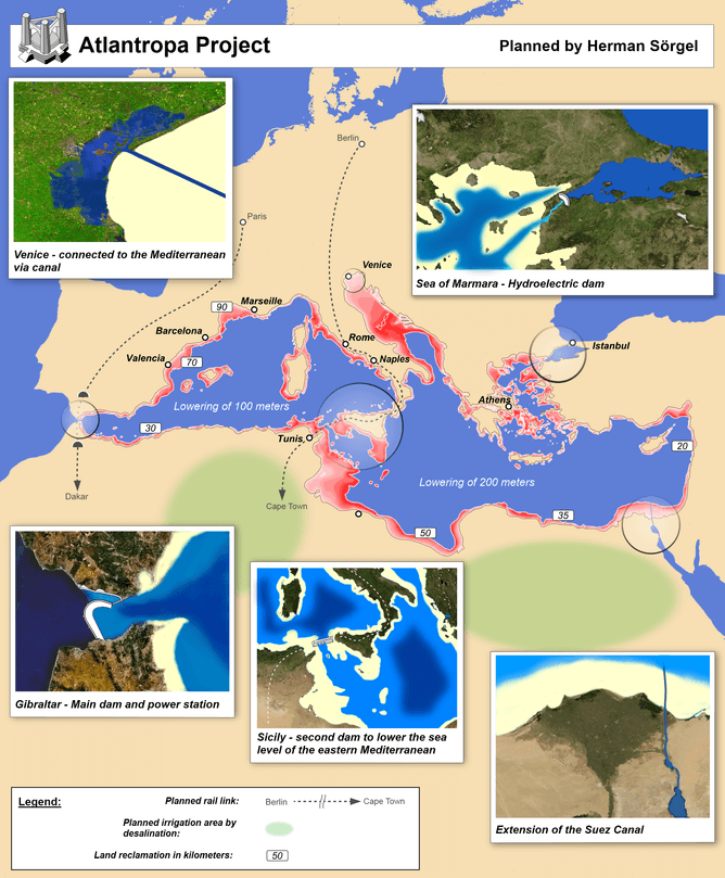 Πηγές: Vidal R. 2017. Atlantropa: The Colossal 1920s Plan To Dam The Mediterranean And Create A Supercontinent. IFLS, iflscienc, wikipedia, environmentandsociety ,cabinetmagazine…