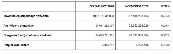 Για το μήνα Δεκέμβριο, το νέο ληξιπρόθεσμο έφτασε τα 1.344 εκ., ενώ πέρυσι την ίδια περίοδο είχε φτάσει τα 1.065 εκ. (αύξηση κατά 26%) Να σημειωθεί ότι την ίδια περίοδο το 2019 είχε φτάσει τα 7.497 εκ. (μείωση κατά 24 %). Από αυτό το ποσό οι απλήρωτοι φόροι είναι στα 5,685 δισ. ευρώ ( από 7,497 δισ. ευρώ το 2019). Για το μήνα Δεκέμβριος το νέο ληξιπρόθεσμο έφτασε τα 665 εκ., ενώ πέρυσι την ίδια περίοδο είχε φτάσει τα 1.030εκ. (μείωση κατά 35,45%)