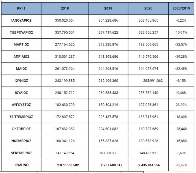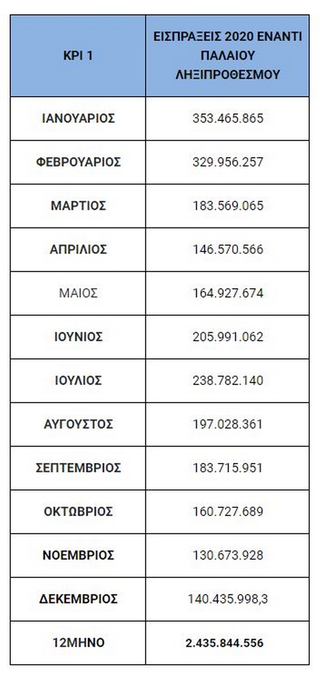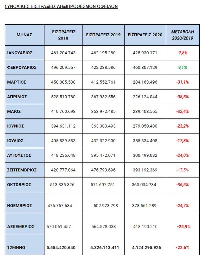 Για το 12μηνο , το νέο ληξιπρόθεσμο έφτασε τα 5.685εκ. , ενώ την ίδια περίοδο το 2019 είχε φτάσει τα 7.497 εκ. (μείωση κατά 24 %).