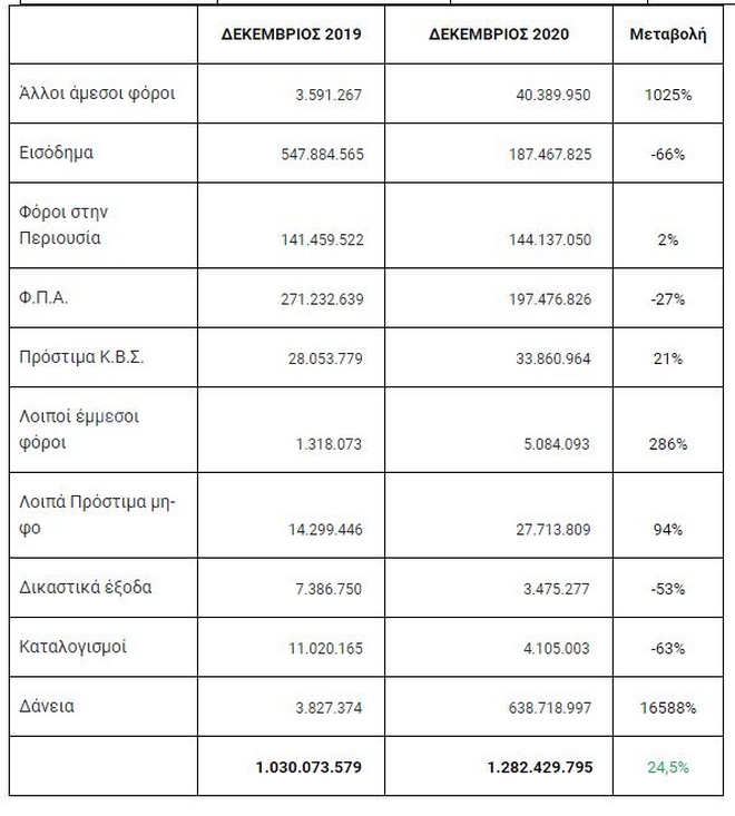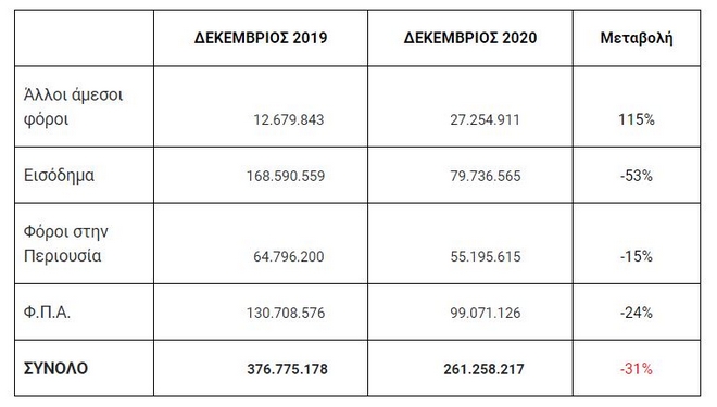 Σε ό,τι αφορά τις εισπράξεις έναντι νέου ληξιπροθέσμου για Δεκέμβριο (εξαιρουμένων των μη φορολογικών κατηγοριών), έφτασαν τα 279 εκ. (έναντι 394εκ. την αντίστοιχη περίοδο του 2019).