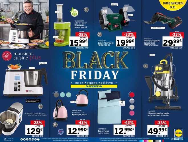 Στην Ελλάδα η πρώτη αλυσίδα σούπερ μάρκετ που έδειξε να να έχει εμπορικά αντανακλαστικά στο Black Friday είναι η Lidl η οποία για τις 24 Νοεμβρίου έχει ήδη προγραμματίσει να κάνει εκπτώσεις σε 11 προϊόντα της, κυρίως ηλεκτρικές συσκευές και μηχανήματα ενώ δεν λείπουν και τα τρόφιμα. Το μέγεθος των εκπτώσεων που αφορούν μόνο την συγκεκριμένη ημέρα ξεκινάει από 28% και φτάνει έως 43%.
