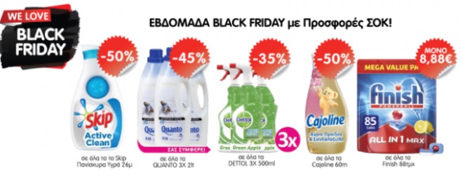 Στα ηλεκτρονικά σούπερ μάρκετ οι προσφορές για την Black Friday αφορούν κυρίως καθαριστικά και απορρυπαντικά, με έμφαση στις μεγάλες συσκευασίες ή στις πολυσυσκευασίες. Παράλληλα υπάρχουν αρκετές προσφορές – όπως όμως και τις υπόλοιπες ημέρες – όπου για κάθε προϊόν προσφέρεται ένα ακόμη δωρεάν.