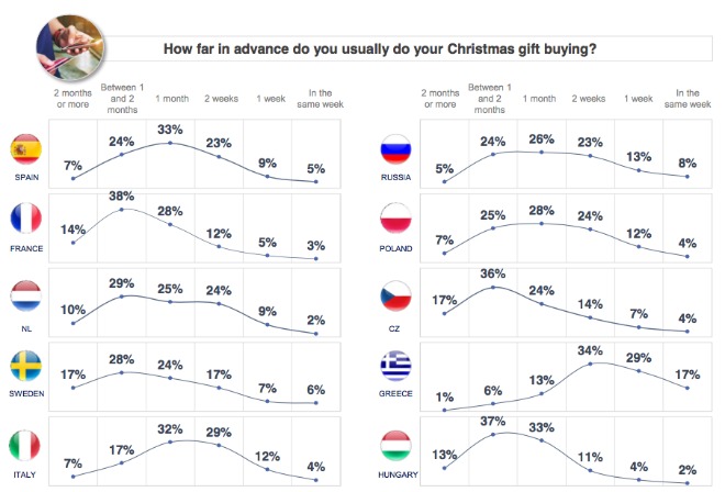 Το 80% των αγορών οι Έλληνες θα το πραγματοποιήσουν τις δύο τελευταίες εβδομάδες όταν ο Μέσος Όρος των 10 ευρωπαικών κρατών είναι για την συγκεκριμένη περίοδο στο 38% (σ.σ. και θα ήταν πολύ χαμηλότερο αν δεν συμμετείχε η Ελλάδα).