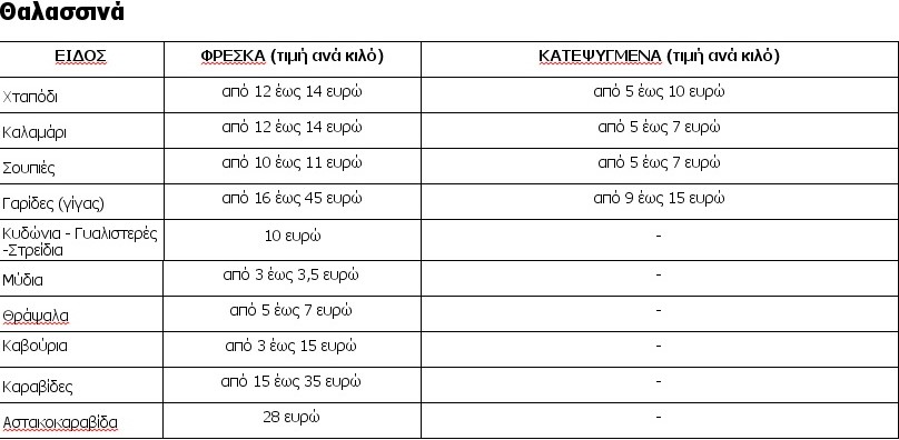 Ενδεικτικά οι τιμές για τα θαλασσινά πού κυμαίνονται;