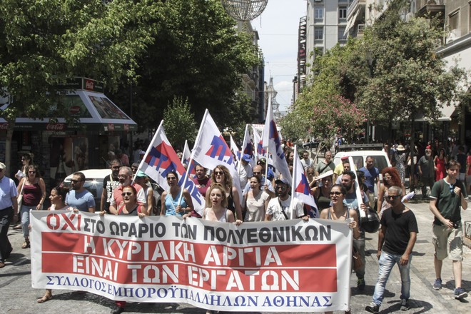"Κάτω τα χέρια από τις Κυριακές και από τις ζωές μας" φώναξαν οι διαδηλωτές που συγκεντρώθηκαν από νωρίς το πρωί της Κυριακής στην Ερμού, προκειμένου να διαμαρτυρηθούν για τα ανοιχτά καταστήματα. Περιορισμένη η κίνηση του αγοραστικού κοινού, μικροένταση στη Θεσσαλονίκη