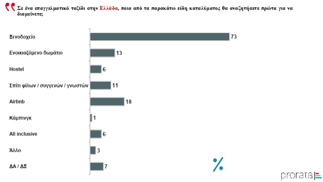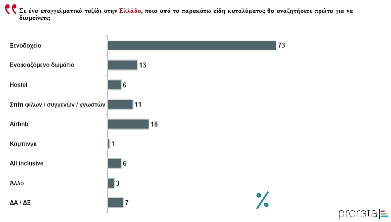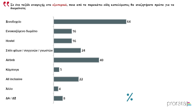 Οι ερωτώμενοι όταν ταξιδεύουν στην Ελλάδα για αναψυχή φαίνεται να αναζητούν πρώτα καταλύματα όπως ενοικιαζόμενα δωμάτια και ξενοδοχεία και λιγότερο κάποιο φιλικό/συγγενικό σπίτι για φιλοξενία ή κατάλυμα Airbnb. Η τάση αυτή διαφέρει όμως όταν το ταξίδι αφορά χώρα του εξωτερικού, όπου το Airbnb είναι μέσα στις δύο πρώτες επιλογές αναζήτησης. Ωστόσο, στην περίπτωση που το ταξίδι είναι επαγγελματικού χαρακτήρα, είτε στην Ελλάδα, είτε σε χώρα του εξωτερικού, οι ερωτώμενοι προτιμούν να αναζητήσουν ξενοδοχεία, ως πιθανό είδος καταλύματος.