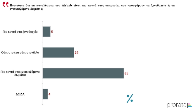 Επίσης, φαίνεται να εδραιώνεται η τάση που θέλει το Airbnb ως μια εναλλακτική λύση που ανταγωνίζεται έντονα τα πιο διαδεδομένα τουριστικά καταλύματα, όπως τα ενοικιαζόμενα δωμάτια και τα ξενοδοχεία, καθώς ενδεικτικά το 65% των ερωτώμενων πιστεύει ότι ένα κατάλυμα Airbnb είναι πιο κοντά στις υπηρεσίες που προσφέρουν τα ενοικιαζόμενα δωμάτια.