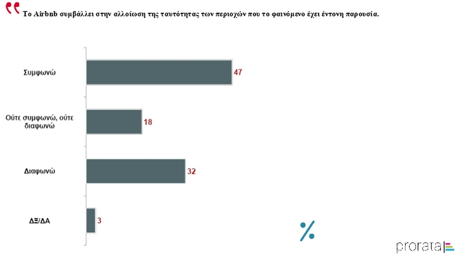 Φαίνεται ακόμα να επιβεβαιώνεται από την έρευνα ένας άξονας προβληματισμού που αναδεικνύεται και από την αντίστοιχη μελέτη του ΙΝΣΕΤΕ αναφορικά με την επίδραση του Airbnb και των παρόμοιων πλατφορμών στη φυσιογνωμία μιας περιοχής, καθώς με βάση τα αποτελέσματα της παρούσας έρευνας σχεδόν 1 στους 2 θεωρεί πως το Airbnb συμβάλλει στην αλλοίωση της ταυτότητας των περιοχών όπου το φαινόμενο έχει έντονη παρουσία.