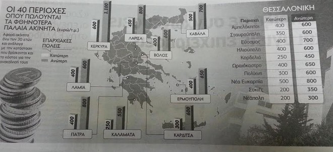 Τα παλιά διαμερίσματα, κυρίως στις φτωχές περιοχές της Αθήνας, αλλά και σε πολλές επαρχιακές πόλεις, έχουν φτάσει να πωλούνται μέχρι και 100 ευρώ το τετραγωνικό, ενώ νεόδμητες κατοικίες πωλούνται ακόμη και κάτω από 1.000 ευρώ το τετραγωνικό μέτρο.