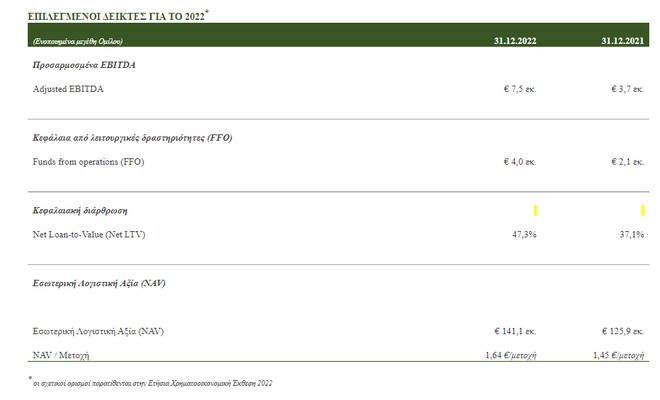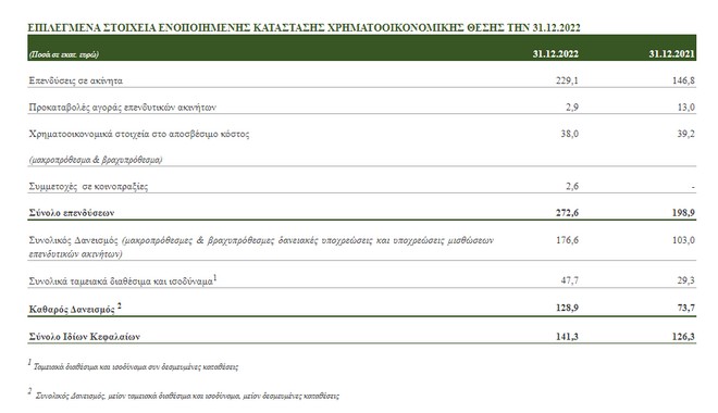 Όμιλος είχε υπό διαχείριση 50 ακίνητα με τη συνολική αξία επενδύσεων να διαμορφώνεται σε € 272,6 εκ., αυξημένη κατά 37% σε σχέση με το 2021.