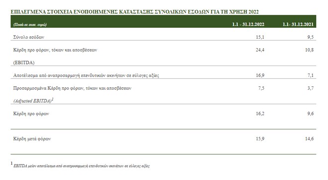 - Αύξηση εσόδων κατά 58% και διπλασιασμός λειτουργικής κερδοφορίας (Adjusted EBITDA), σε ενοποιημένη βάση, σε σχέση με το 2021. Διατήρηση ισχυρής καθαρής κερδοφορίας, με τα ενοποιημένα κέρδη μετά φόρων να διαμορφώνονται σε € 15,9 εκ. για το 2022.