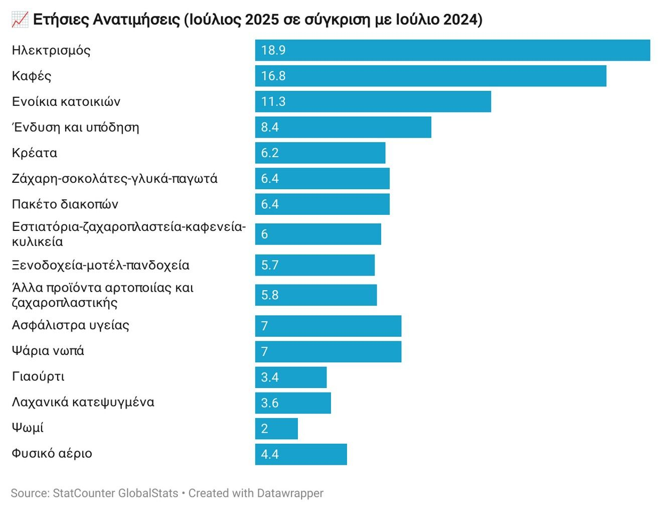 Σύμφωνα με την ΕΛΣΤΑΤ, η αύξηση του γενικού δείκτη τιμών καταναλωτή τον Ιούλιο προήλθε κυρίως από τις μεταβολές στις ακόλουθες ομάδες αγαθών και υπηρεσιών: