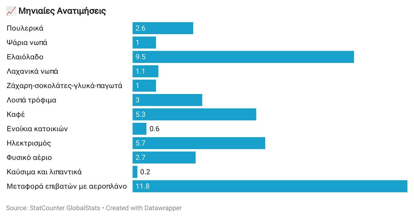 Ειδικότερα, σε ένα έτος οι σημαντικότερες ανατιμήσεις εντοπίζονται σε: Ψωμί (2%), Άλλα προϊόντα αρτοποιίας και ζαχαροπλαστικής (5,8%), Κρέατα (6,2%), Ψάρια νωπά (7%), Γιαούρτι (3,4%), Φρούτα (19,3%), Λαχανικά κατεψυγμένα (3,6%), Ζάχαρη- σοκολάτες- γλυκά- παγωτά (6,4%), Καφέ (16,8%), Ένδυση και υπόδηση (8,4%), Ενοίκια κατοικιών (11,3%), Ηλεκτρισμό (18,9%), Φυσικό αέριο (4,4%), Πακέτο διακοπών (6,4%), Εστιατόρια- ζαχαροπλαστεία- καφενεία- κυλικεία (6%), Ξενοδοχεία- μοτέλ- πανδοχεία (5,7%) και Ασφάλιστρα υγείας (7%).