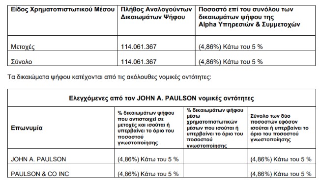 Ειδικότερα, η Alpha Υπηρεσιών & Συμμετοχών ενημερώνει, με ανακοίνωσή της στο Χρηματιστήριο, ότι κατόπιν σχετικής γνωστοποίησης της PAULSON & CO INC. την 5.12.2022, η τελευταία κατέχει κατά την 30.11.2022, έμμεσα μέσω των επενδυτικών κεφαλαίων που διαχειρίζεται 114.061.367 δικαιώματα ψήφου που αντιστοιχούν σε ποσοστό κάτω του 5%, επί του συνόλου δικαιωμάτων ψήφου της Εταιρείας.