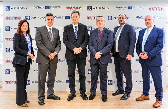 Η υπογραφή της δανειακής σύμβασης πραγματοποιήθηκε την Παρασκευή, 29 Ιουλίου, στα κεντρικά γραφεία της Alpha Bank, παρουσία του Αναπληρωτή Υπουργού Οικονομικών, αρμόδιου για την υλοποίηση του «Ελλάδα 2.0», κ. Θόδωρου Σκυλακάκη και του Διοικητή της Ειδικής Υπηρεσίας Συντονισμού του Ταμείου Ανάκαμψης (ΕΥΣΤΑ), κ. Νίκου Μαντζούφα, από τον Γενικό Διευθυντή Οικονομικών Υπηρεσιών της METRO Α.Ε.Β.Ε., κ. Μανώλη Καρυδάκη. Οικοδεσπότες της εκδήλωσης υπογραφής ήταν ο Γενικός Διευθυντής Wholesale Banking της Alpha Bank, κ. Γιάννης Εμίρης και Στελέχη των Διευθύνσεων Πιστοδοτήσεων Wholesale Banking και Corporate Banking.