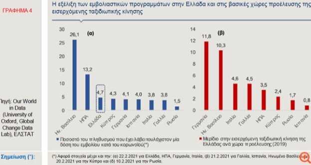 Όπως παρατηρείται στο Γράφημα 4α, άνω του 1/4 των πολιτών στο Ηνωμένο Βασίλειο είχε λάβει τουλάχιστον τη μία δόση του εμβολίου κατά του κορωνοϊού, μέχρι και την τρίτη εβδομάδα του Φεβρουαρίου, ενώ το αντίστοιχο ποσοστό στις ΗΠΑ ανερχόταν σε 13,2%. Στην Γερμανία, την Γαλλία, την Ιταλία, την Ισπανία αλλά και στην Κύπρο, τα ποσοστά εμβολιασμού του πληθυσμού (τουλάχιστον μία δόση, μέχρι και το δεύτερο δεκαήμερο του Φεβρουαρίου) κυμαίνονταν μεταξύ 3,8%-4,3%, ενώ, στη Ρωσία, σε 1,5%. Αξίζει να σημειωθεί ότι συνολικά από τις ανωτέρω χώρες προήλθε σχεδόν το 40% των εισερχόμενων τουριστών, το 2019.