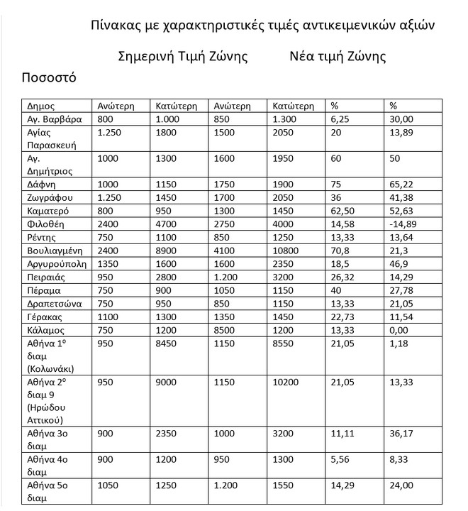 Διψήφιες αυξήσεις στις αντικειμενικές αξίες σε πολλές περιοχές όπου η μεσαία τάξη, σημείο αναφοράς του πολιτικού συστήματος, διαθέτει την περιουσία της καταγράφονται μετά τις χτεσινές ανακοινώσεις από το Υπ. Οικονομικών. Έτσι, άνοδος, μέσα από τη διαδικασία υποβολής εισηγήσεων από τους πιστοποιημένους εκτιμητές, εντοπίζεται σε ζώνες περιοχών, όπως: το κέντρο Αθήνας, από 1.850 σε 3.600 ευρώ (αύξηση 95%), το Ναύπλιο, από 1.300 σε 2.200 ευρώ (αύξηση 69%), το Παλαιό Φάληρο, από 1.650 σε 2.750 ευρώ (αύξηση 67%), και το Ελληνικό, από 1.700 σε 2.200 ευρώ (αύξηση 29%). Επίσης σε Καματερό, Αγία Βαρβάρα, Άγιο Δημήτριο, Ιλιον, Άγιοι Ανάργυροι, Κυψέλη, Περιστέρι και Δάφνη οι αντικειμενικές αξίες ανεβαίνουν σε ποσοστά έως και 75%.